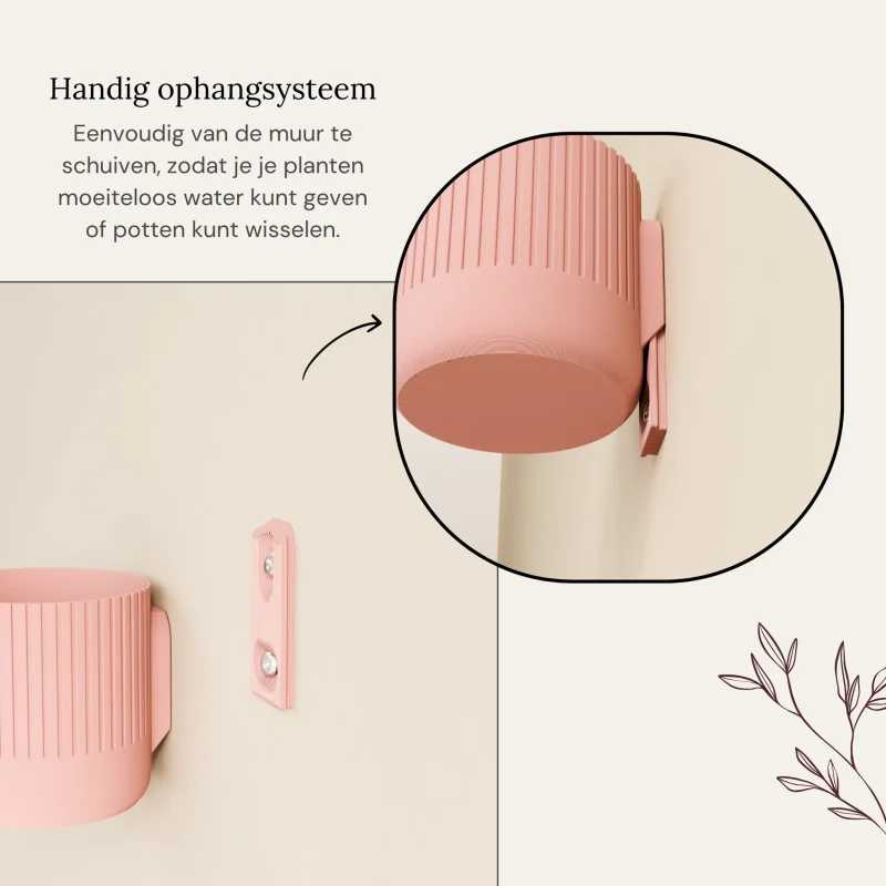 Met het slimme ophangsysteem schuif je de potten makkelijk op hun plek en haal je ze er net zo eenvoudig weer af om je plantjes water te geven of te wisselen. Zo creëer je in een handomdraai je eigen groene wand.