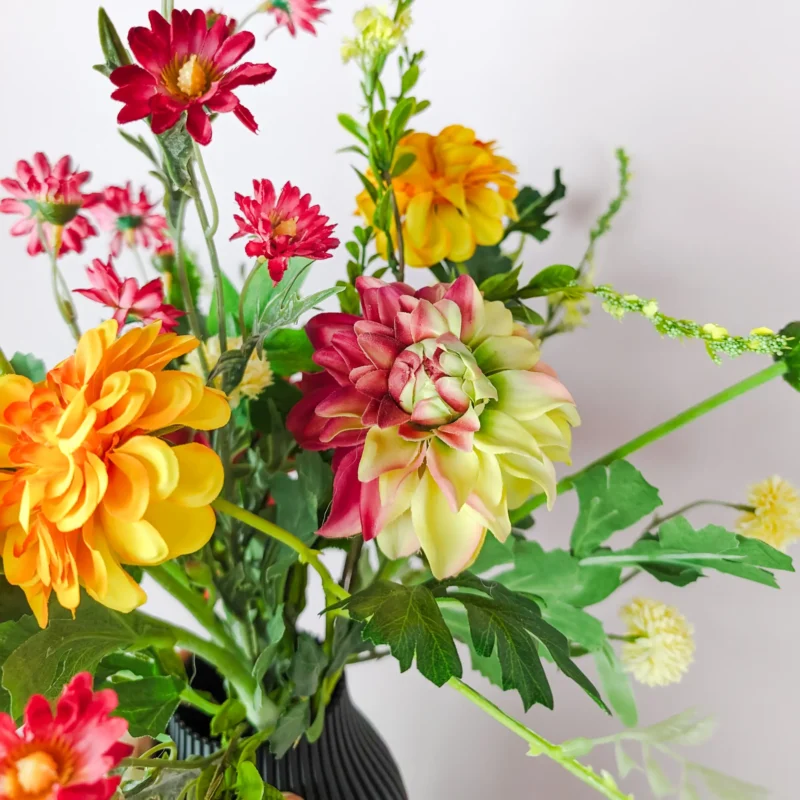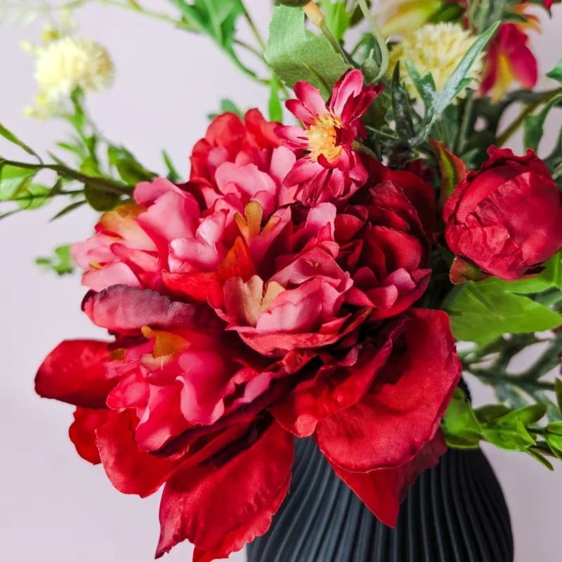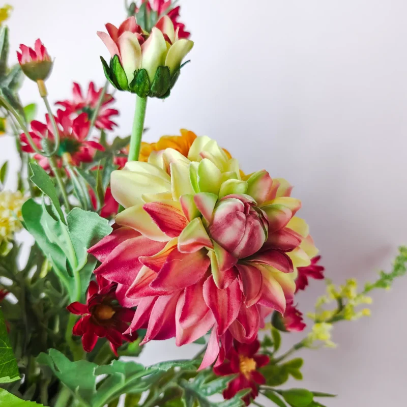 Florence is een kleurrijk zijden boeket met sprankelende rode en oranje tinten. Dit boeket brengt direct sfeer in je interieur en zorgt voor een gezellige, uitnodigende uitstraling.
