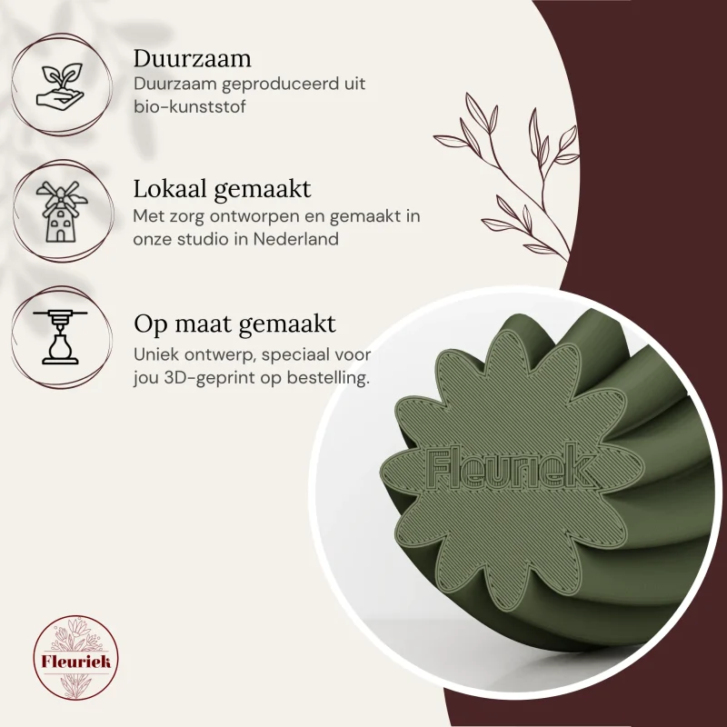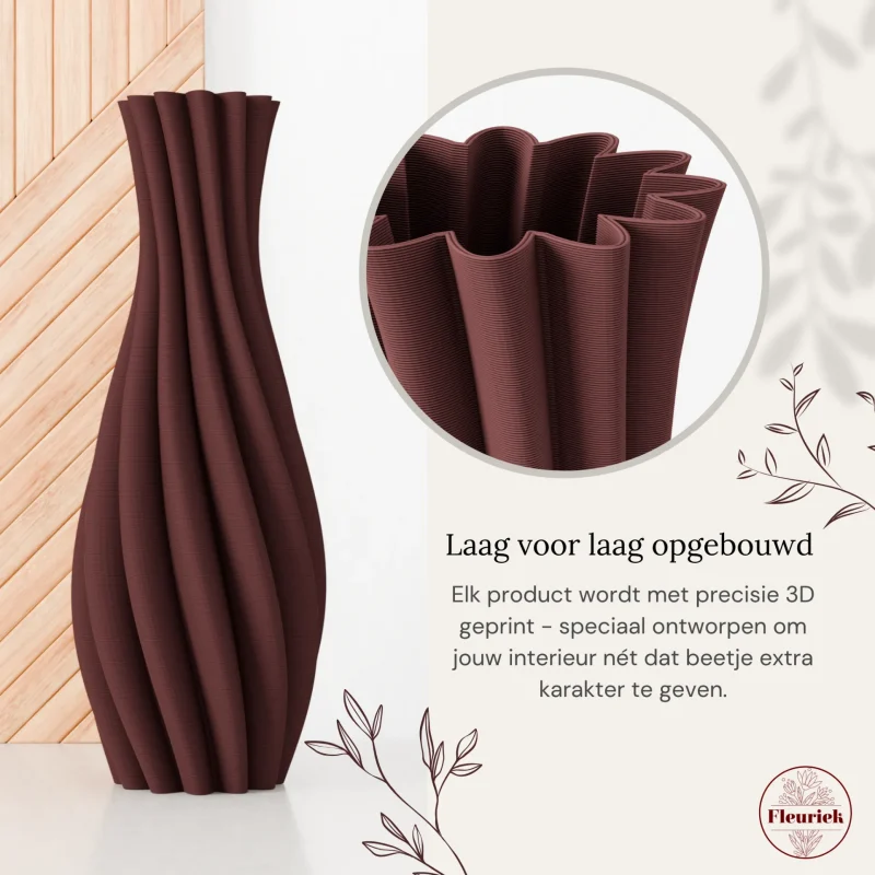 Maar TANJA is niet alleen stijlvol, ze is ook duurzaam. Elke vaas wordt lokaal 3D-geprint van gerecycled kunststof: licht van gewicht, stevig en milieuvriendelijk. Een bewuste keuze voor wie houdt van mooi design met een kleinere ecologische voetafdruk.